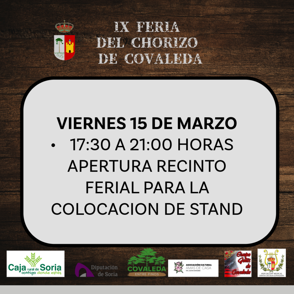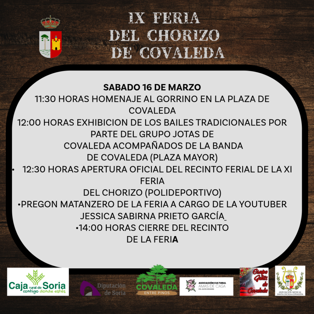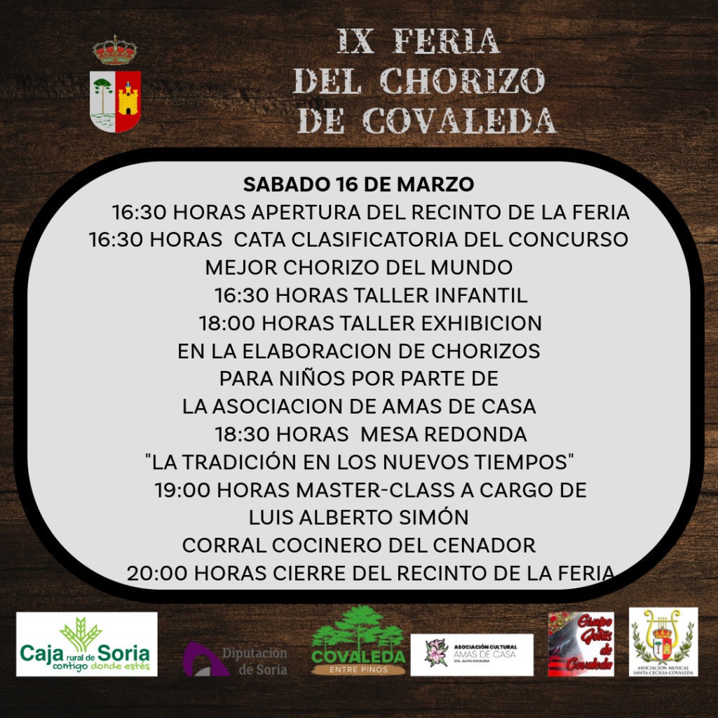 La consolidación de la Feria del Chorizo también lo demuestran los nuevos colaboradores que se suman a este evento vital para Covaleda. En la novena edición se suma Caja Rural de Soria y la Diputación de Soria seguirá acompañando a esta feria. Ambos se unen al esfuerzo que hacen las asociaciones locales como la de Amas de Casa Santa Julita sin duda uno de los motores de la feria junto a la Banda Municipal de Covaleda o el Grupo de Danzantes.