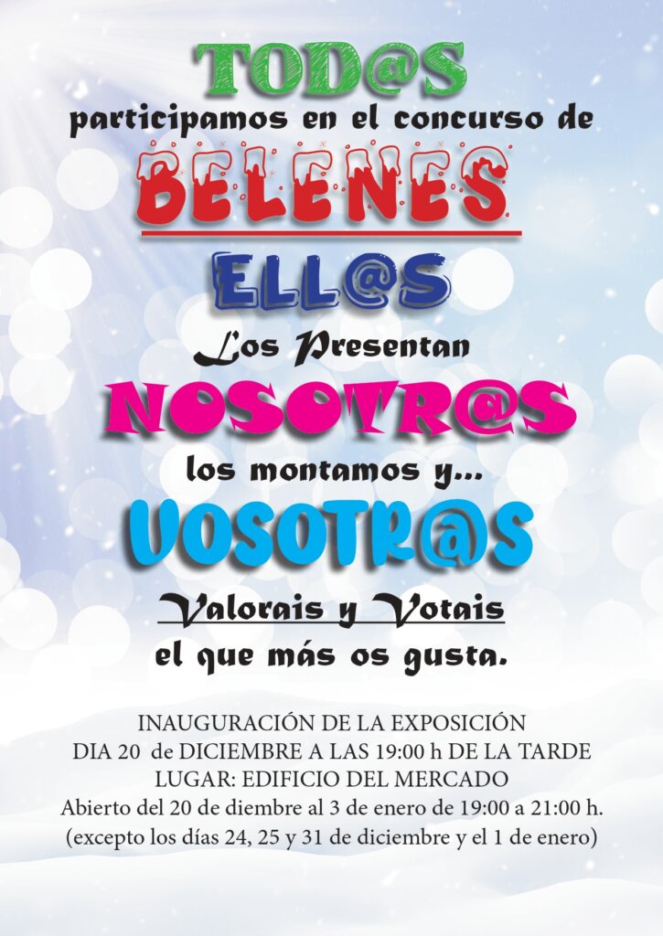 Los Belenes estarán expuestos al público en general para su visita del 20 de diciembre de 2024 al 3 de enero de 2024, ambos incluidos, en horario de 19:00 a 21:00 horas, excepto los días 24, 25 y 31 de diciembre y el 1 de enero de 2025, en el edificio del Mercado Antiguo.